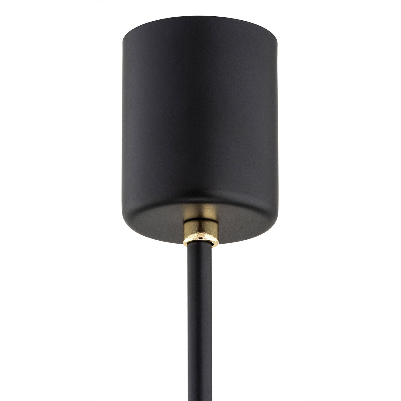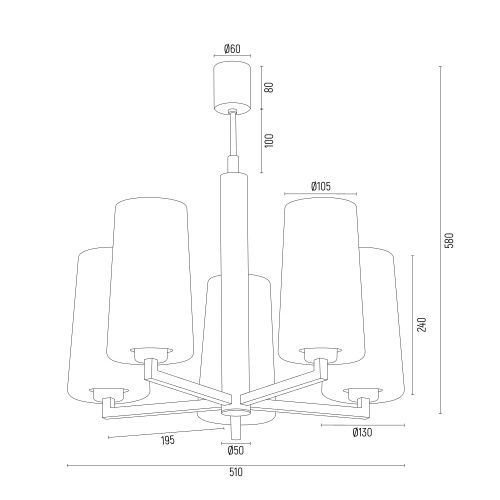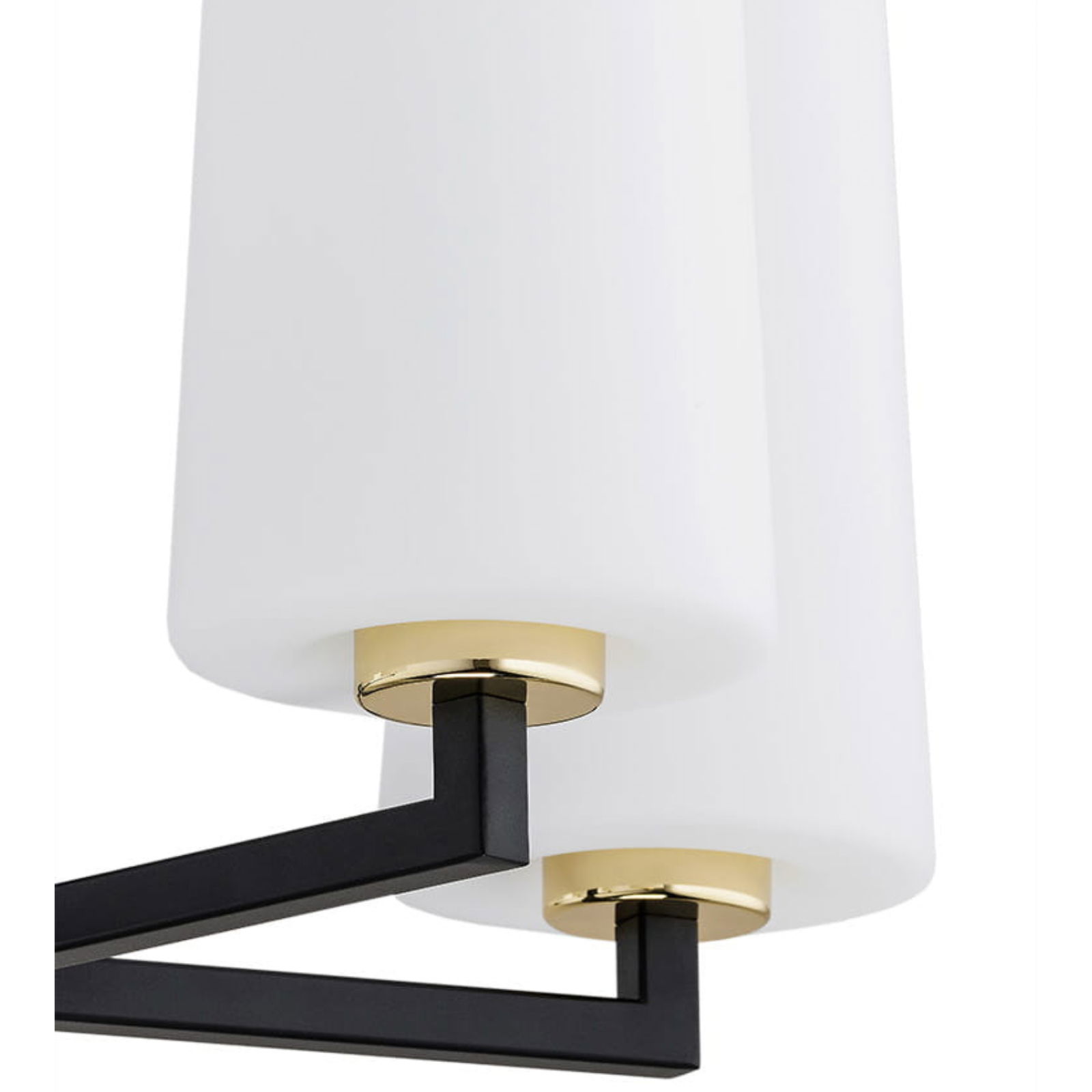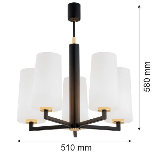 The black Melot 5 Lamp Chandelier has a black matt frame with brass details and five white opal glass cylinder shades. The chandelier holds the four shades on horizontal arms.