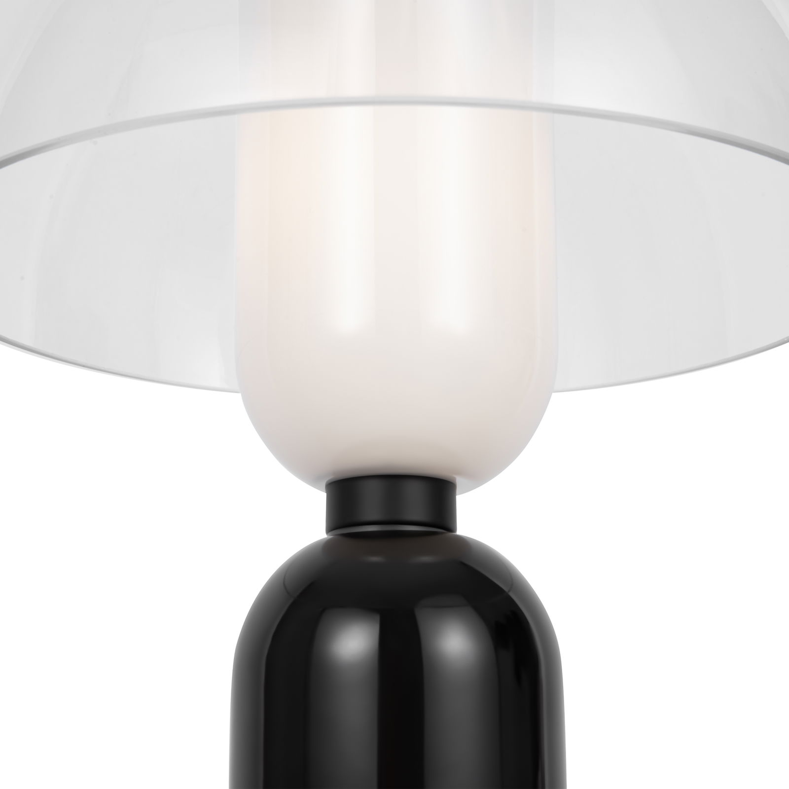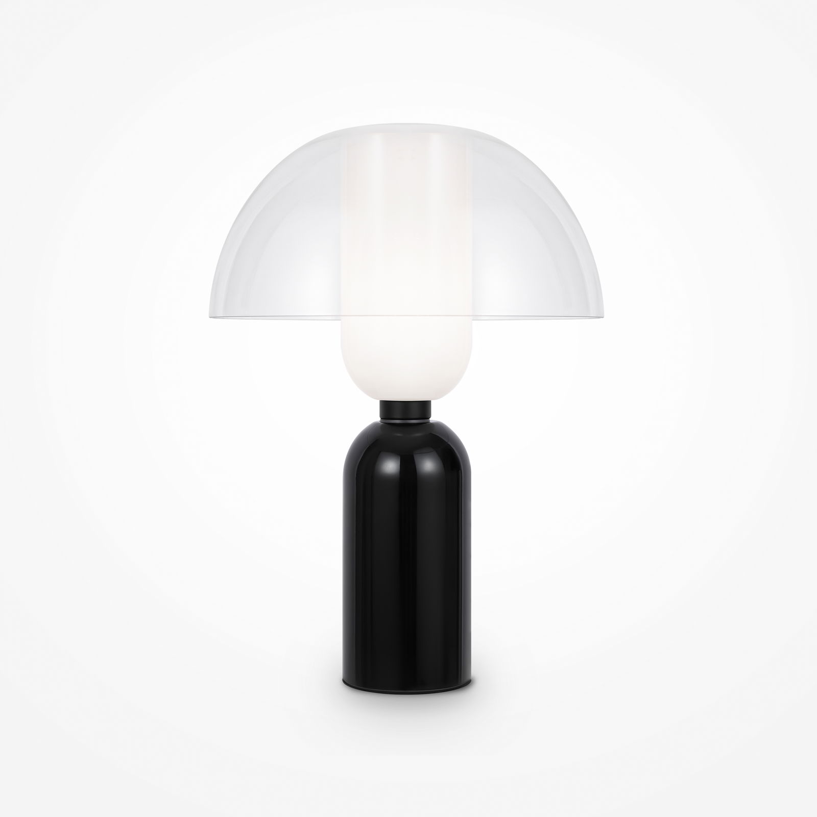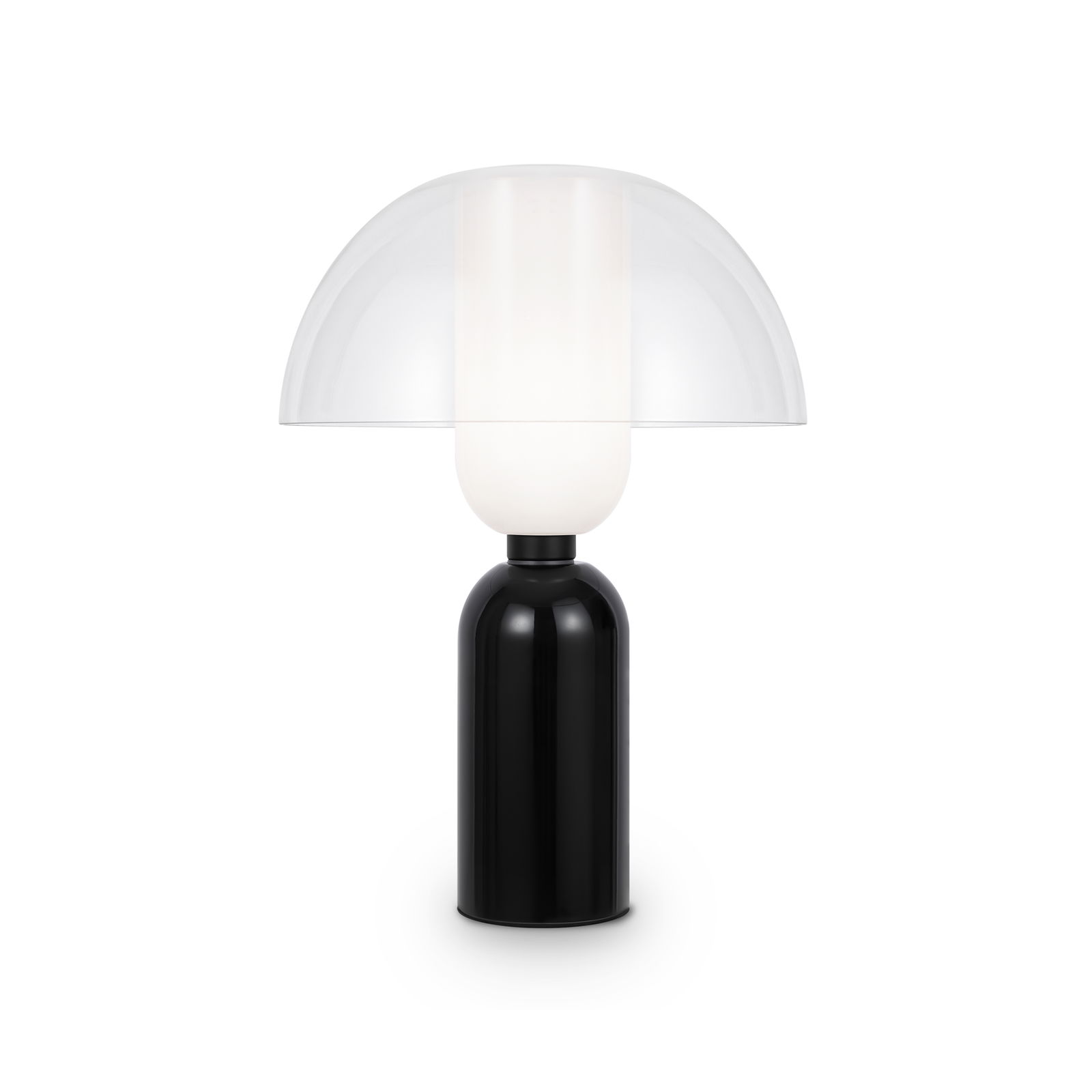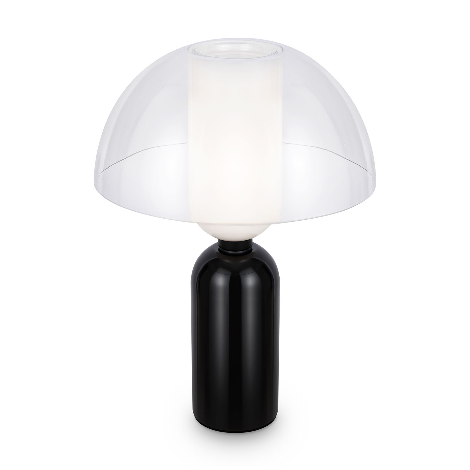 The Memory Mushroom Black Table Lamp has a black ceramic cylinder base with a white glass cylinder shade in the middle section and a clear glass dome shade that sits on top.