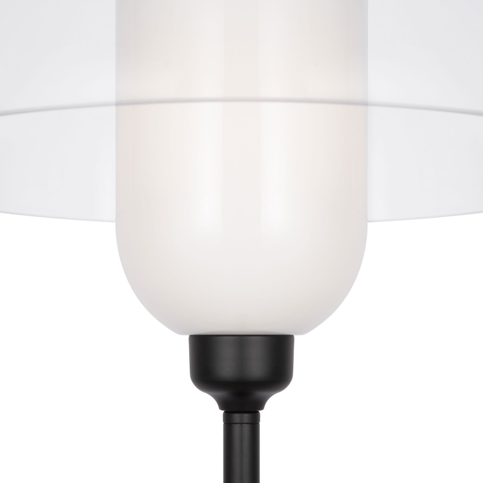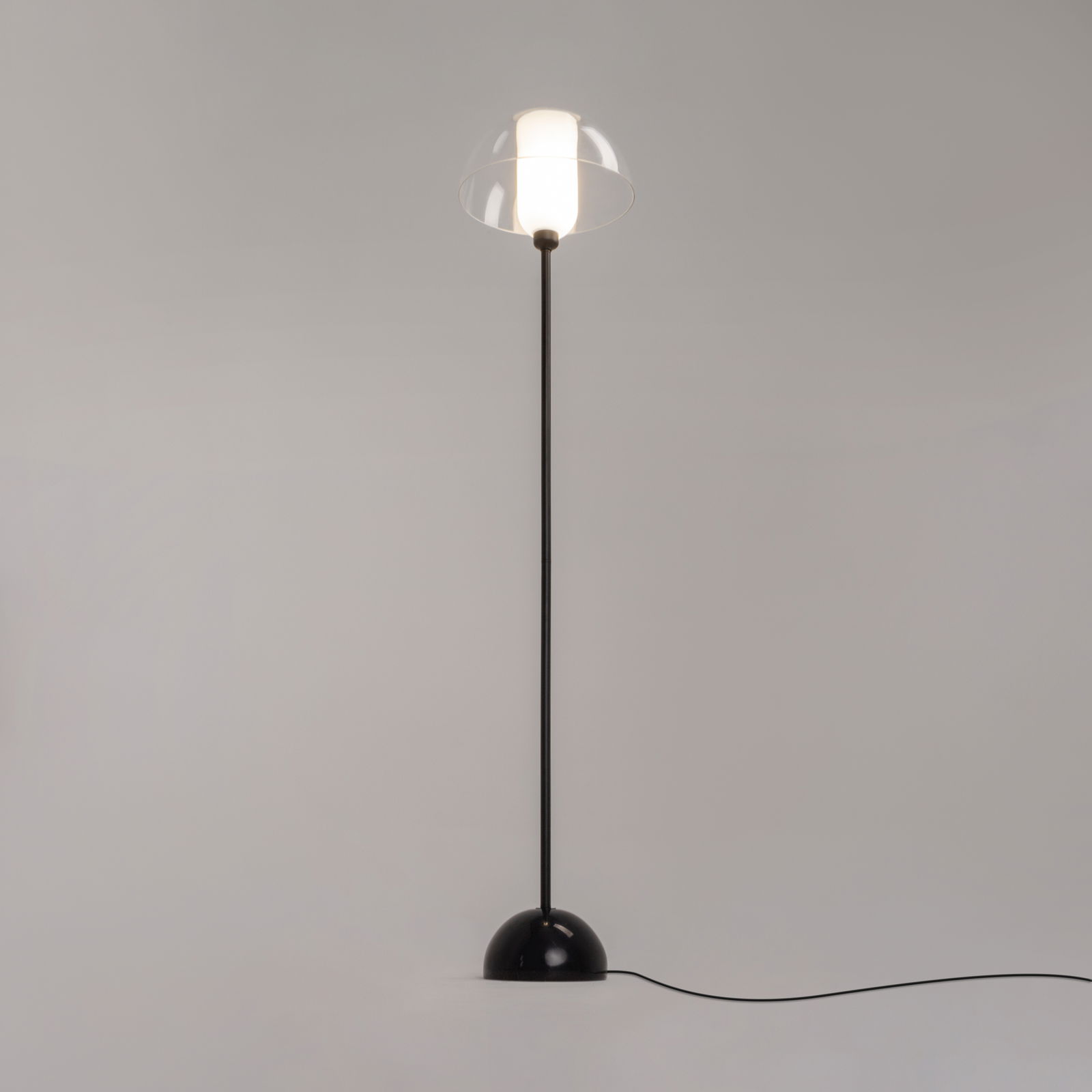 The Memory Mushroom Floor Lamp is 139cm tall with a clear glass dome shade that sits on top of a white cylinder glass shade, which covers the lamp holder.