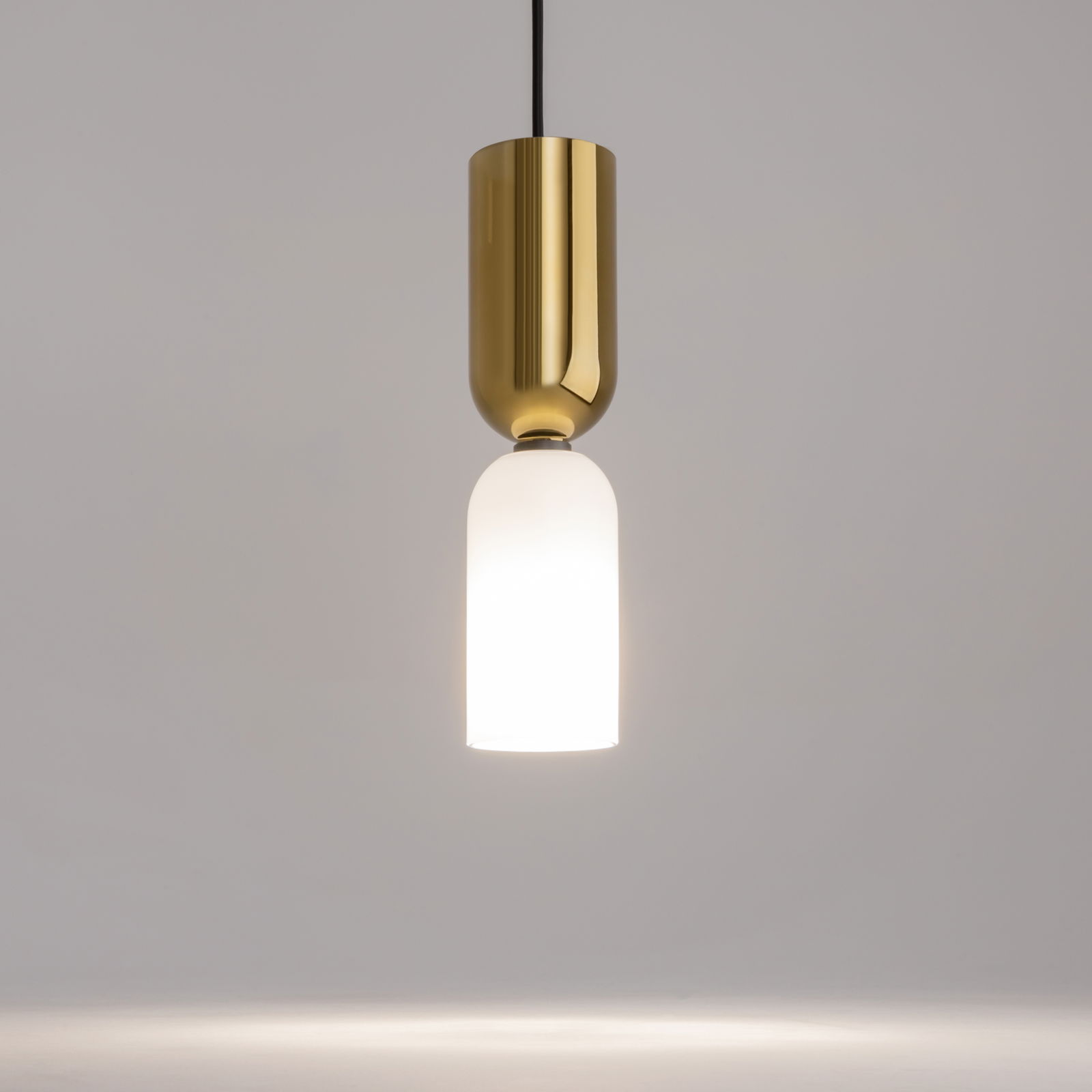 The Memory Pendant Light hangs from a black metal ceiling rose with white opal and gold glass cylinder shades pointing in the opposite direction. The lamp holder sits inside the white glass and points in a downward direction.