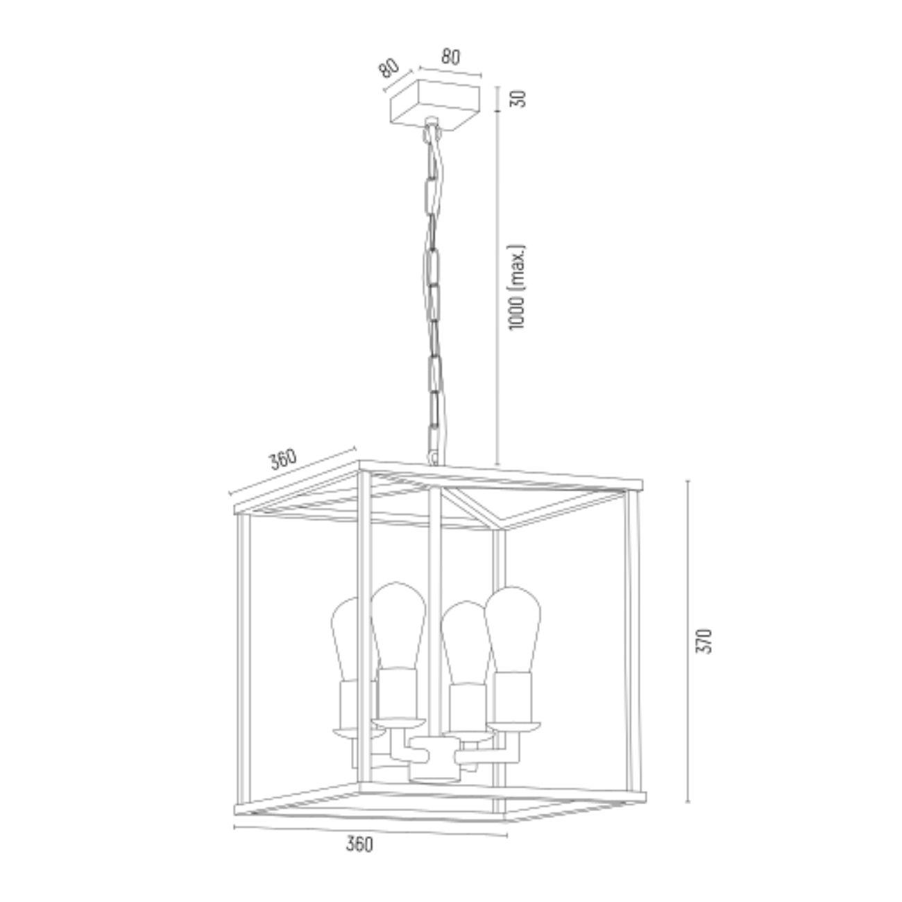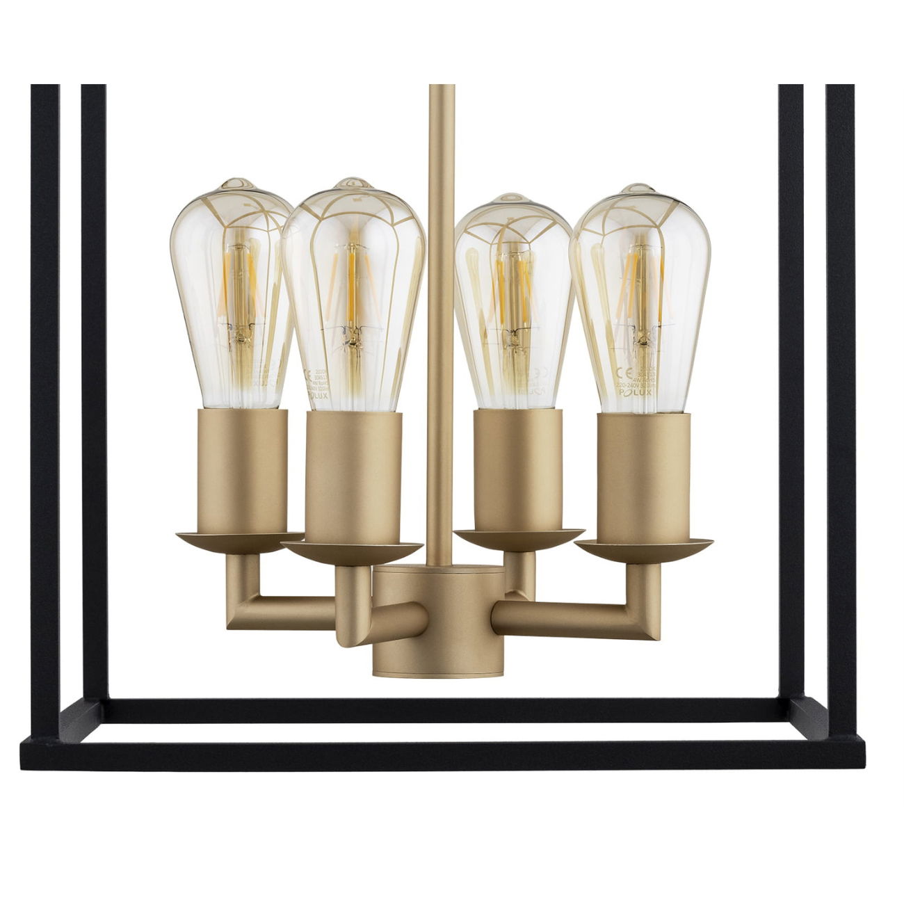 The Monzano 4 Light Square Pendant Lamp has a black metal cage with old gold lamp holders and suspension. Four exposed bulbs sit on candelabra-style holders in the centre of the hanging pendant light.