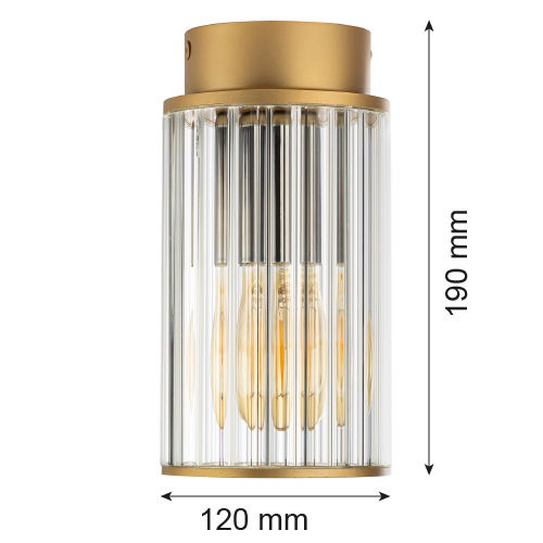 The gold Nordfor IP44 Ceiling Light mounts close to the ceiling with a ribbed glass cylinder and gold metal finish. The ceiling light holds one E27 bulb inside clear ribbed glass that runs from top to bottom.