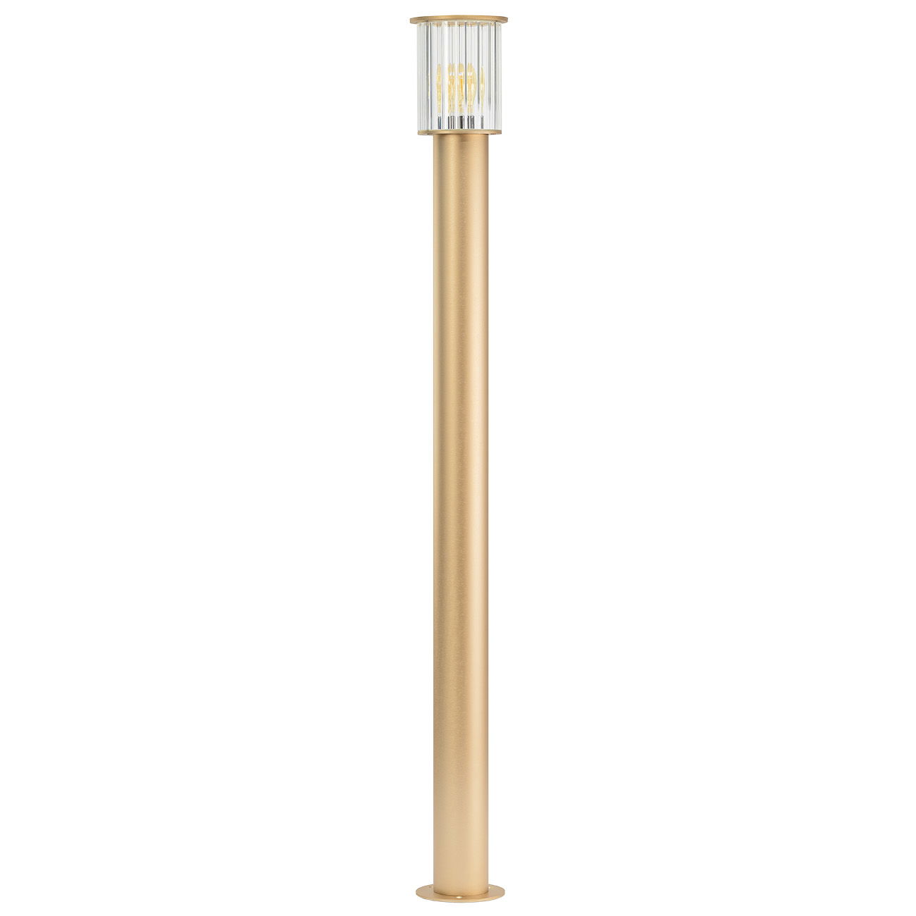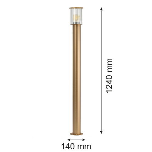 The Gold Nordfor Large Outdoor Bollard Light stands 124cm tall with a gold finish and clear glass shade. The clear glass cylinder has a vertical ribbed pattern and sits on a gold metal pole, which can secure into solid bases such as concrete or wood.