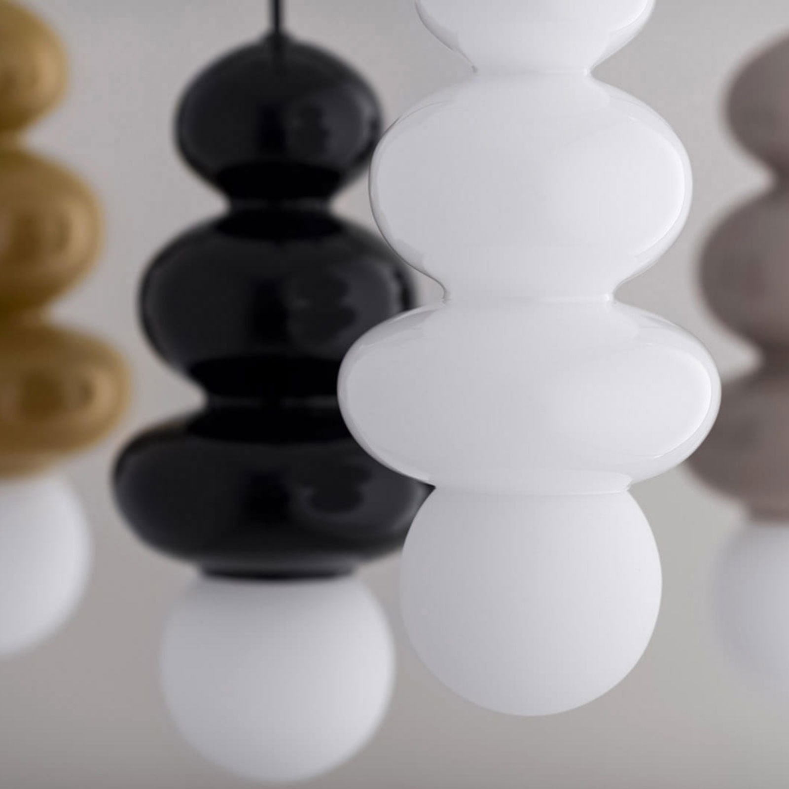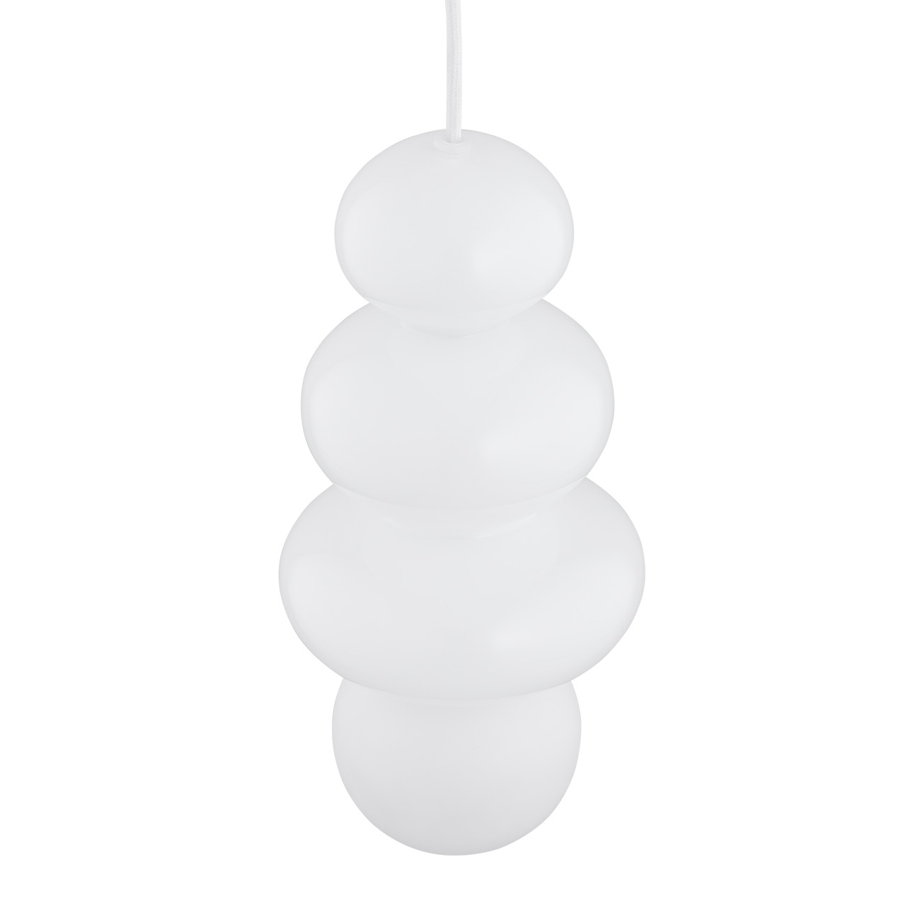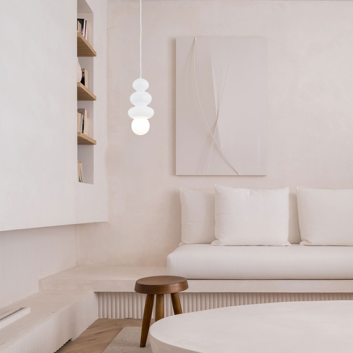 The white Orla IP44 Pendant Lamp has four white opal glass sections with contrasting matt and gloss finishes. The pendant lamp stacks three gloss white glass shades in graduated sizes above one matt white opal glass sphere. Due to the IP44 rating, this can be used as a bathroom pendant light if required, however, it does work in any internal room.