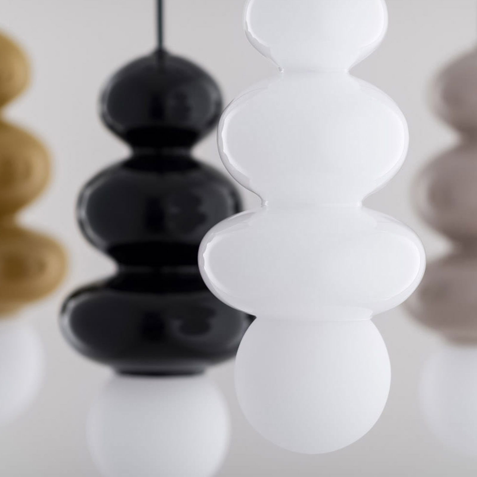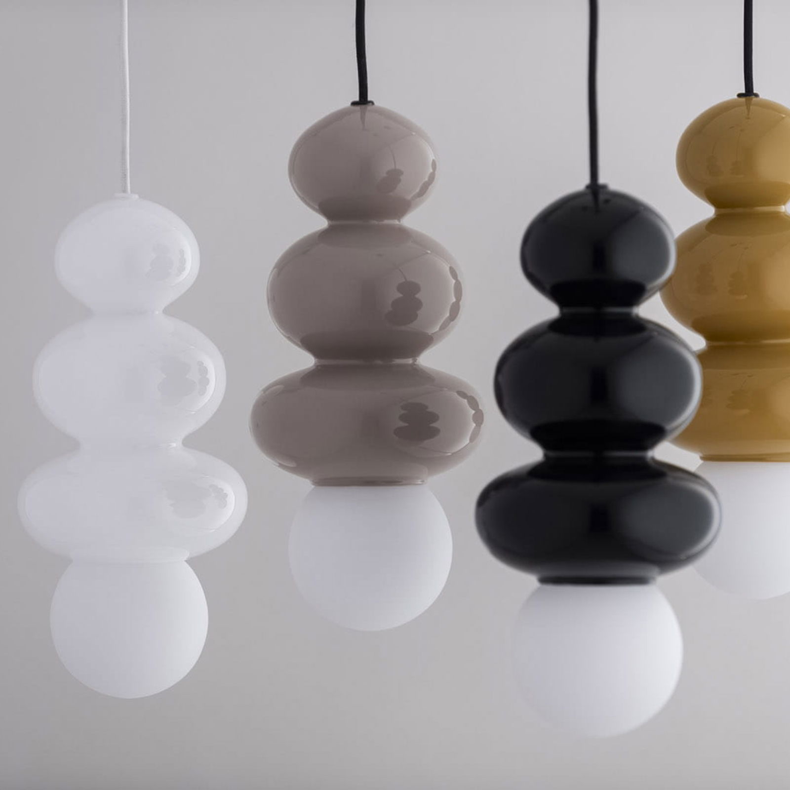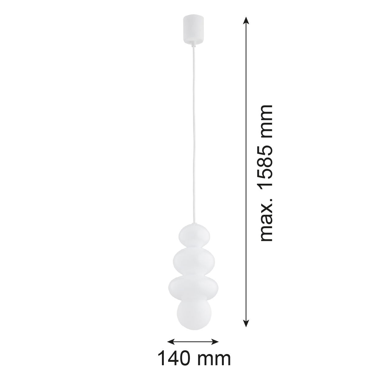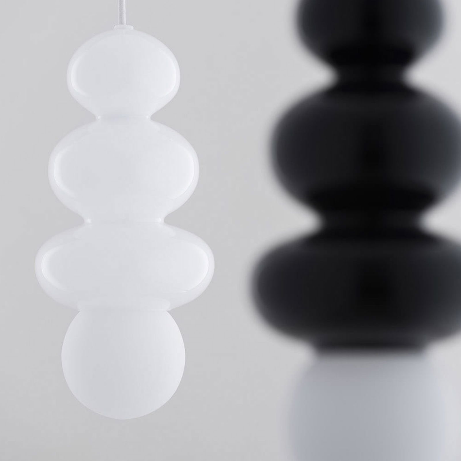 The white Orla IP44 Pendant Lamp has four white opal glass sections with contrasting matt and gloss finishes. The pendant lamp stacks three gloss white glass shades in graduated sizes above one matt white opal glass sphere. Due to the IP44 rating, this can be used as a bathroom pendant light if required, however, it does work in any internal room.