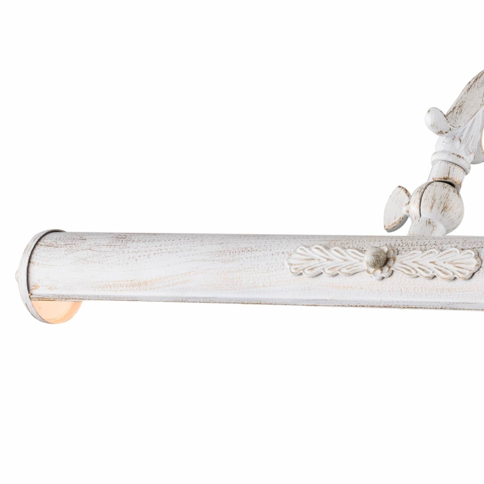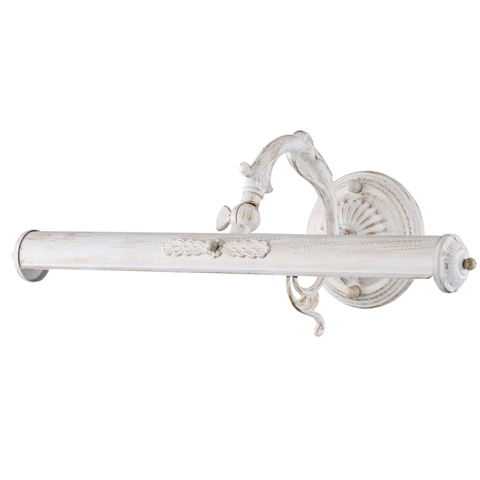 The Picasso White Picture Lamp is 44.5cm wide with a distressed finish. This wall light has gold showing through the white and an adjustable shade which can be set at different angles.