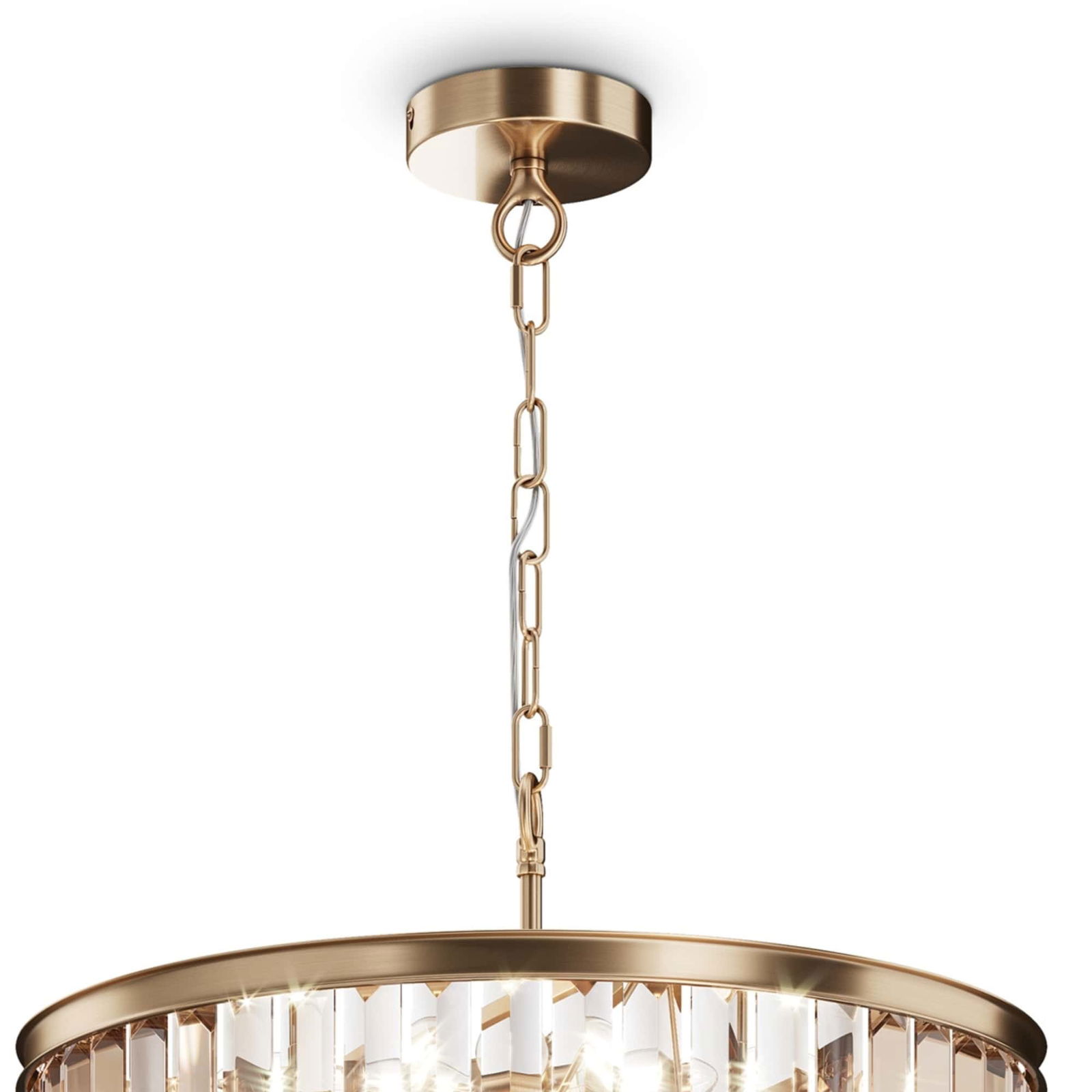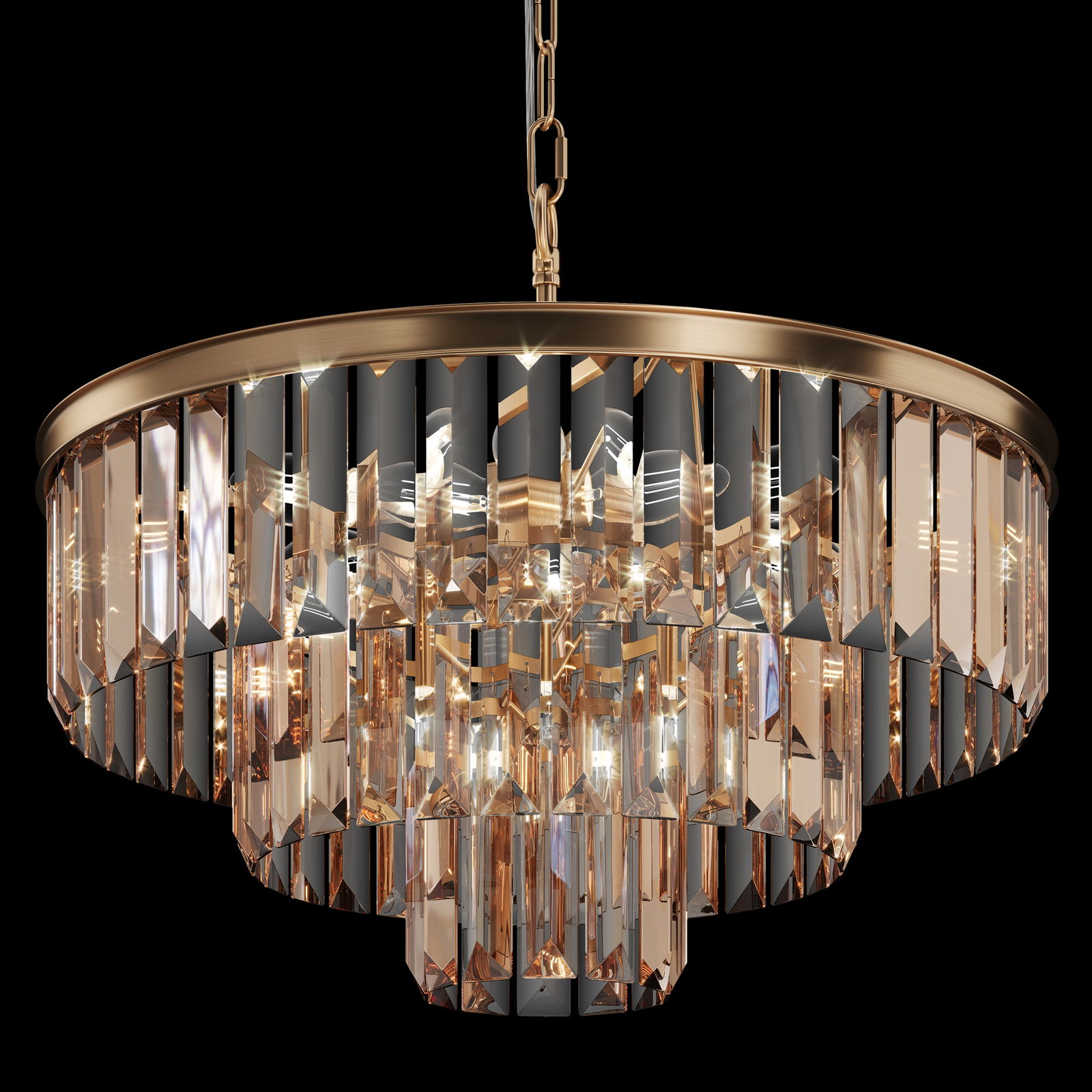 - The crystals are amber-tinted rectangular glass prisms in three tiers.