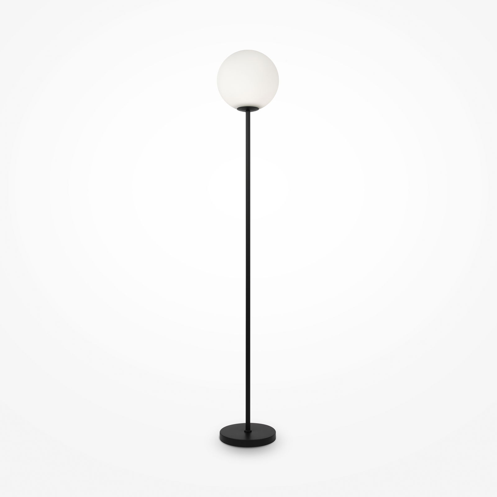 The Ring Black Floor Lamp sits 155cm tall with a white glass globe on top. The black thin metal stem is attached to a 22cm wide circular base.