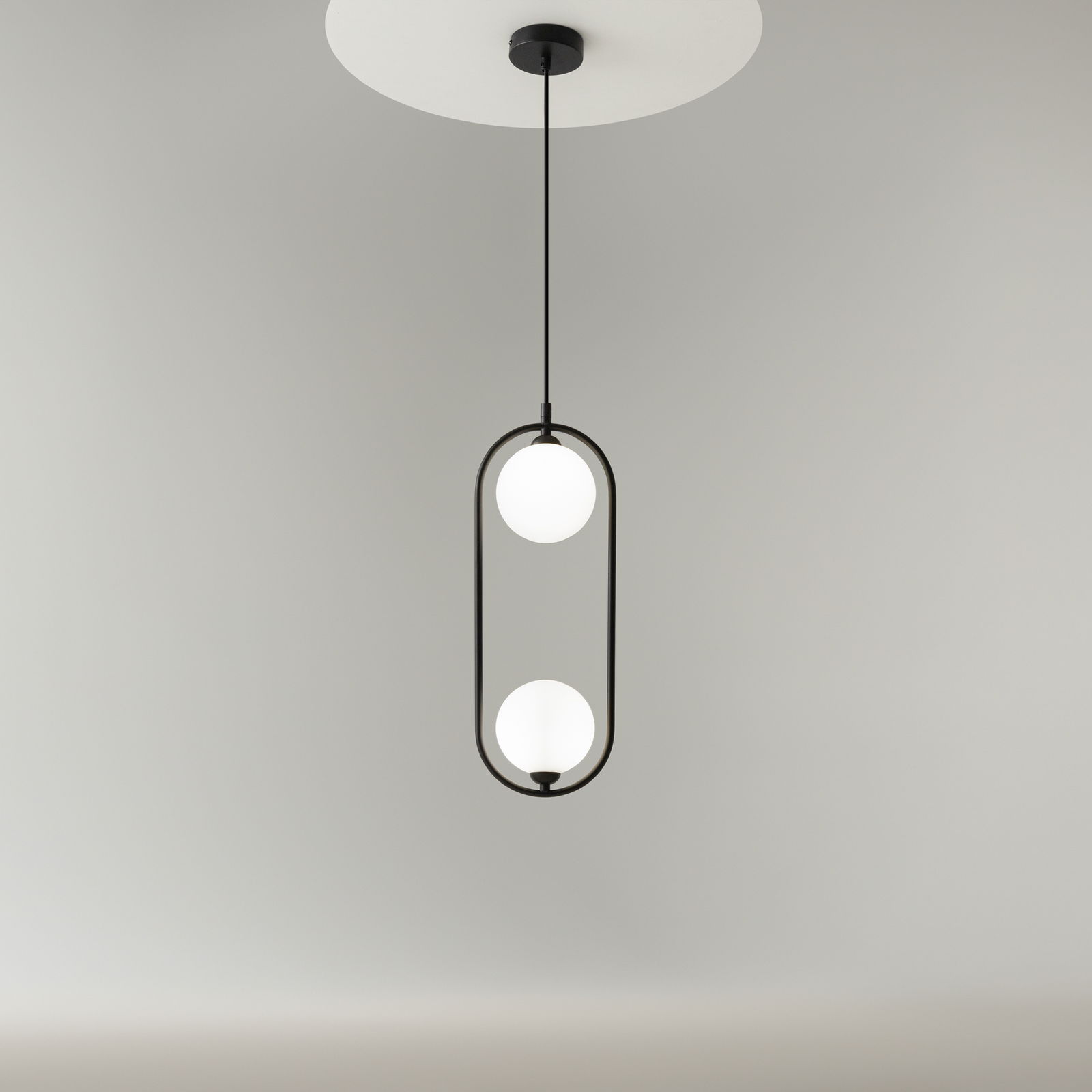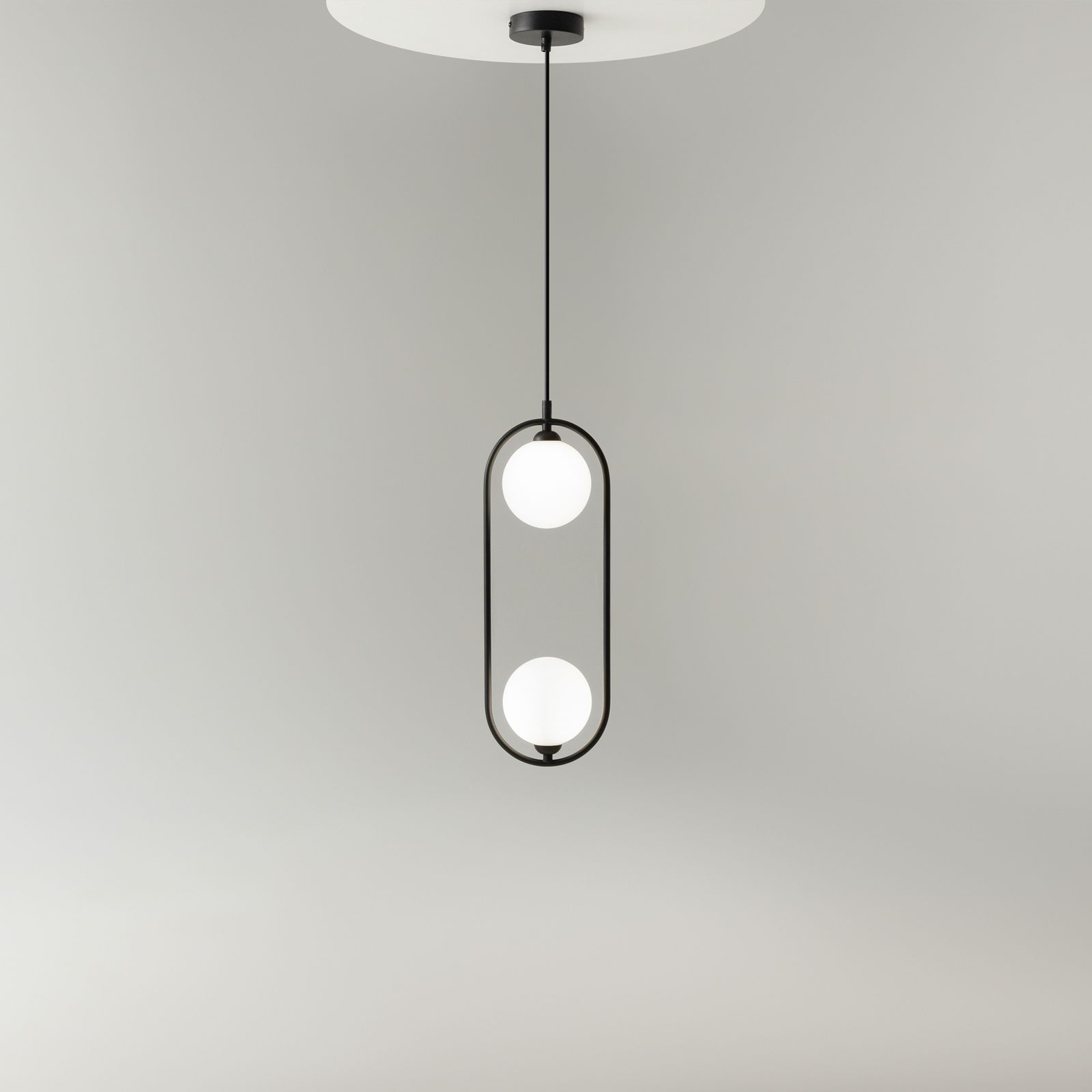 The Ring Black Pendant Lamp holds two white glass globes within a vertical oval frame. The globes sit one above the other inside the black metal loop.