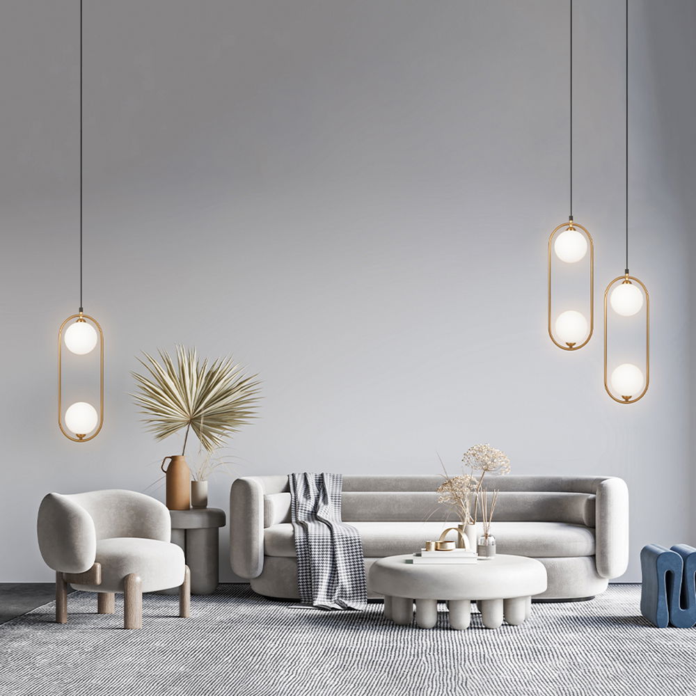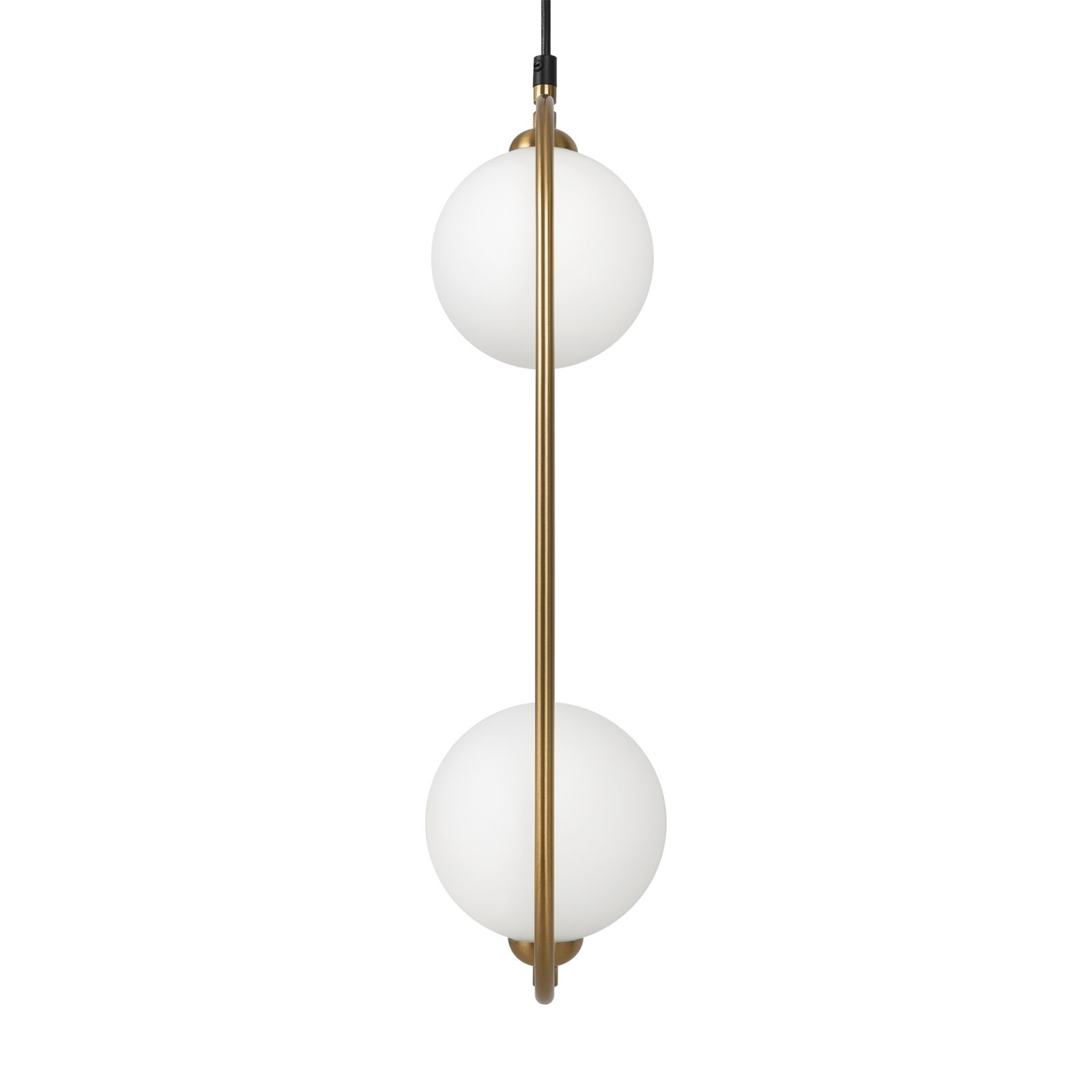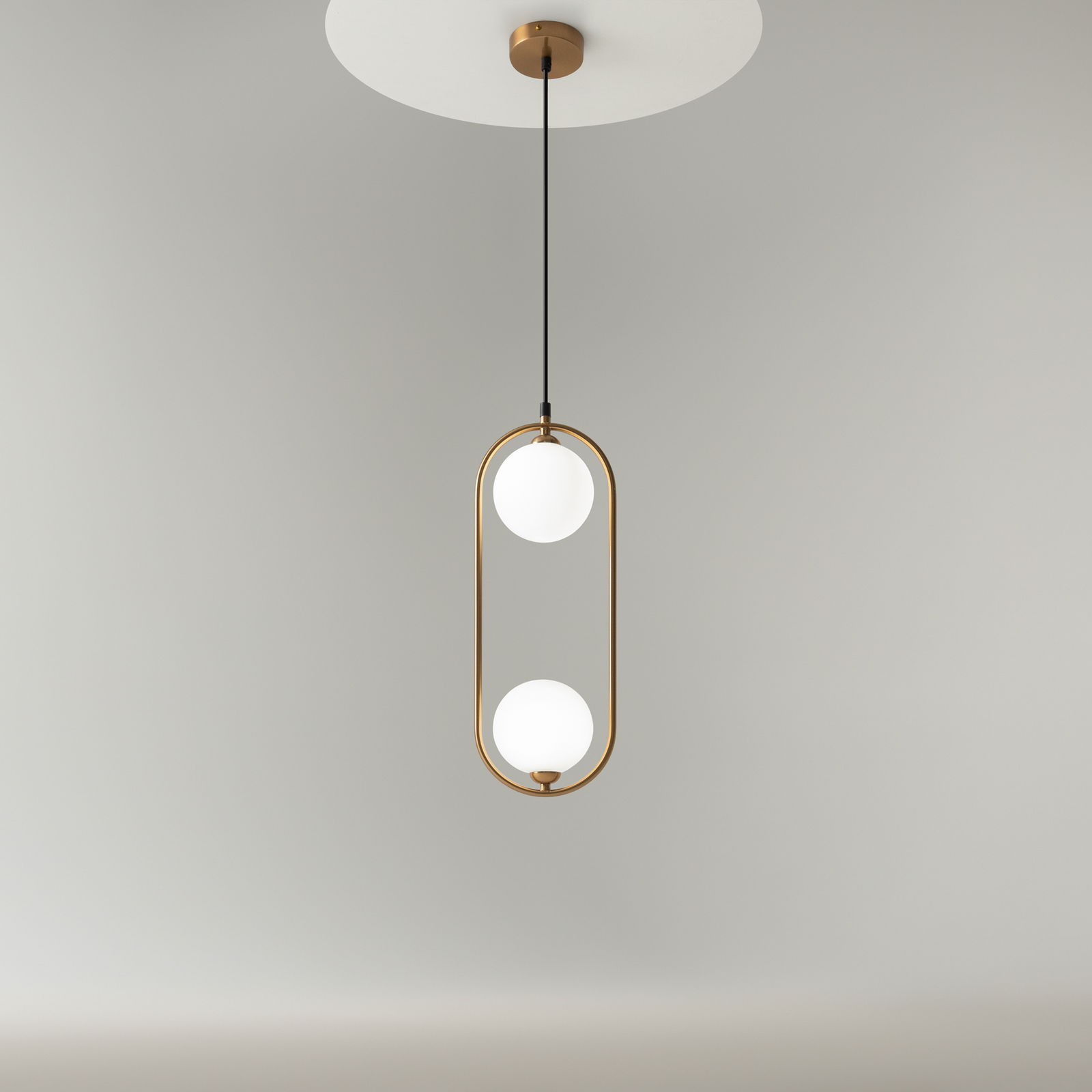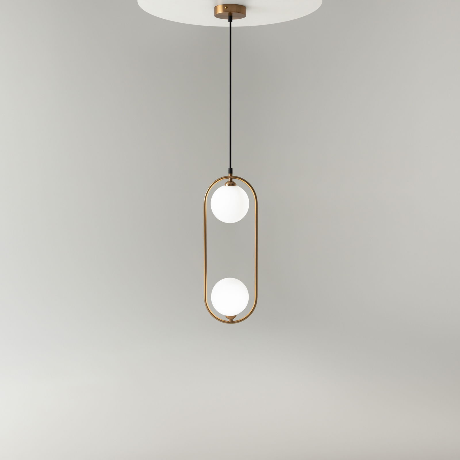 The Ring Brass Pendant Lamp holds two white glass globes in a brass oval loop. The globes sit vertically inside the brass frame, facing each other.