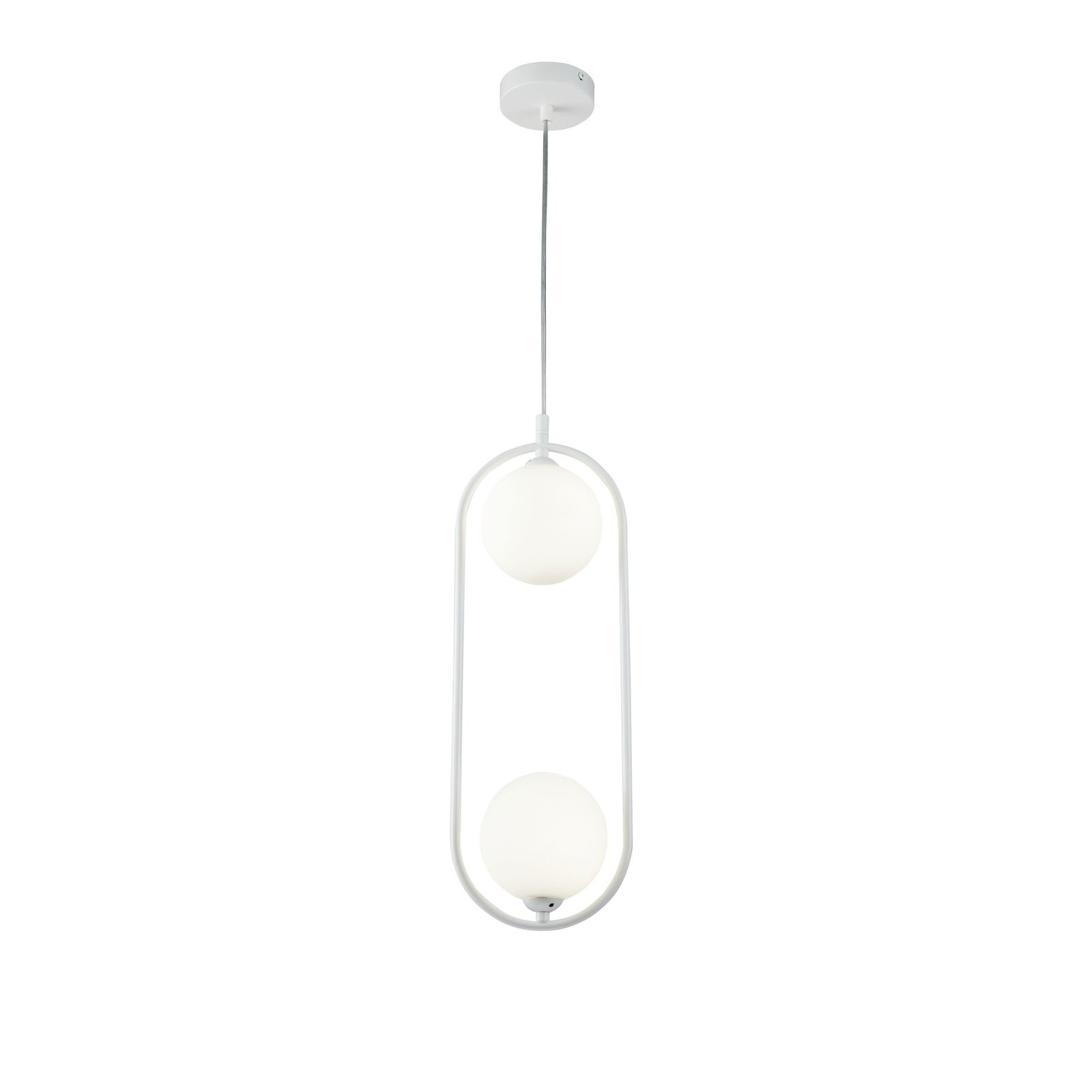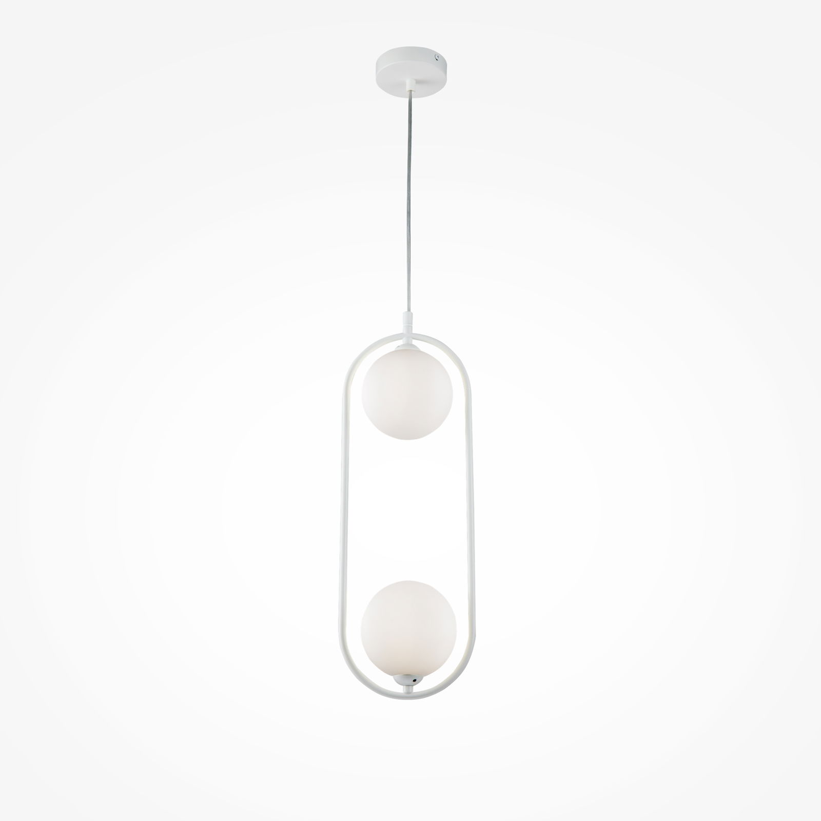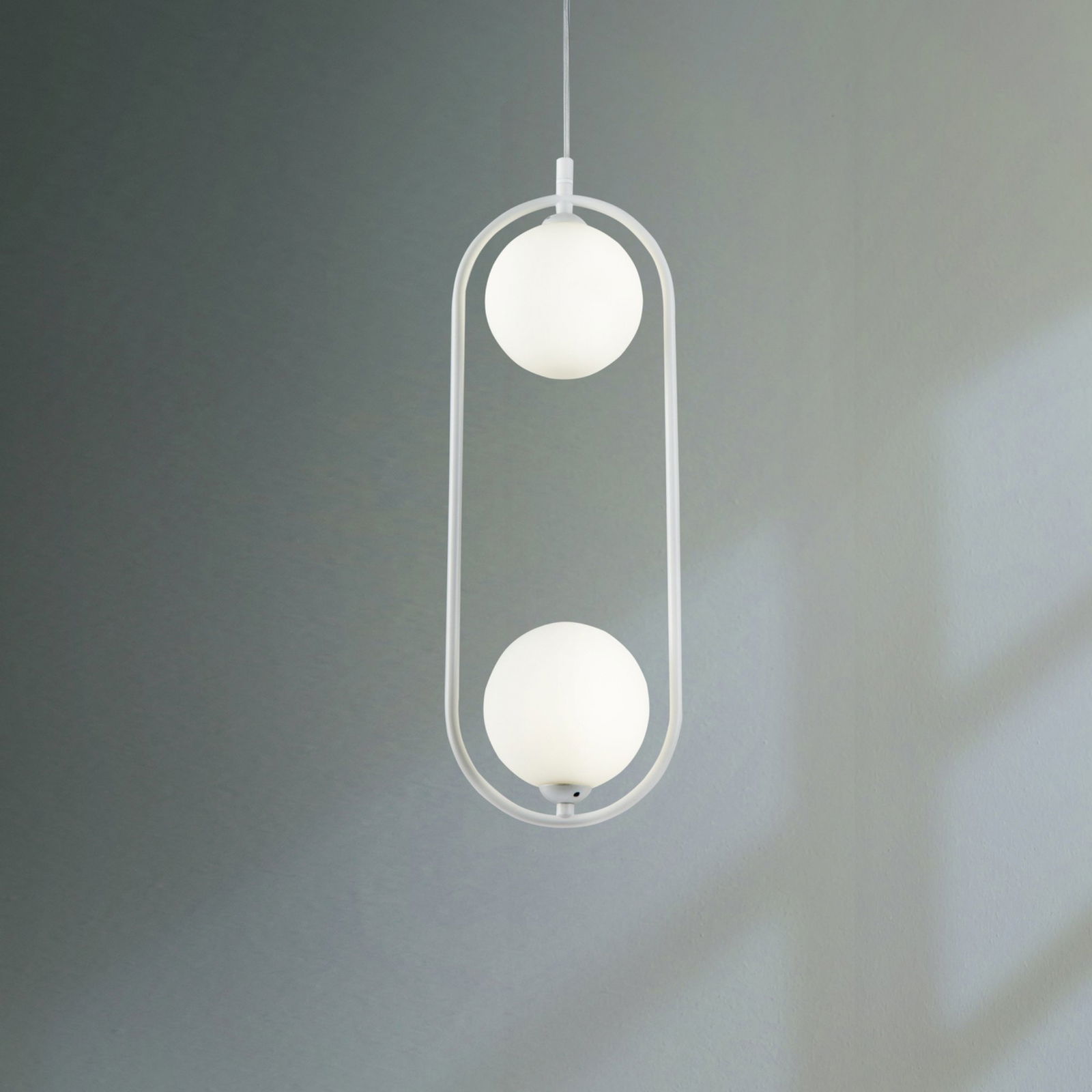 The Ring White Pendant Light has two white glass globes inside an oval metal frame, and the globes sit one above the other. It is 17cm wide and drops from a white ceiling plate on a wire.