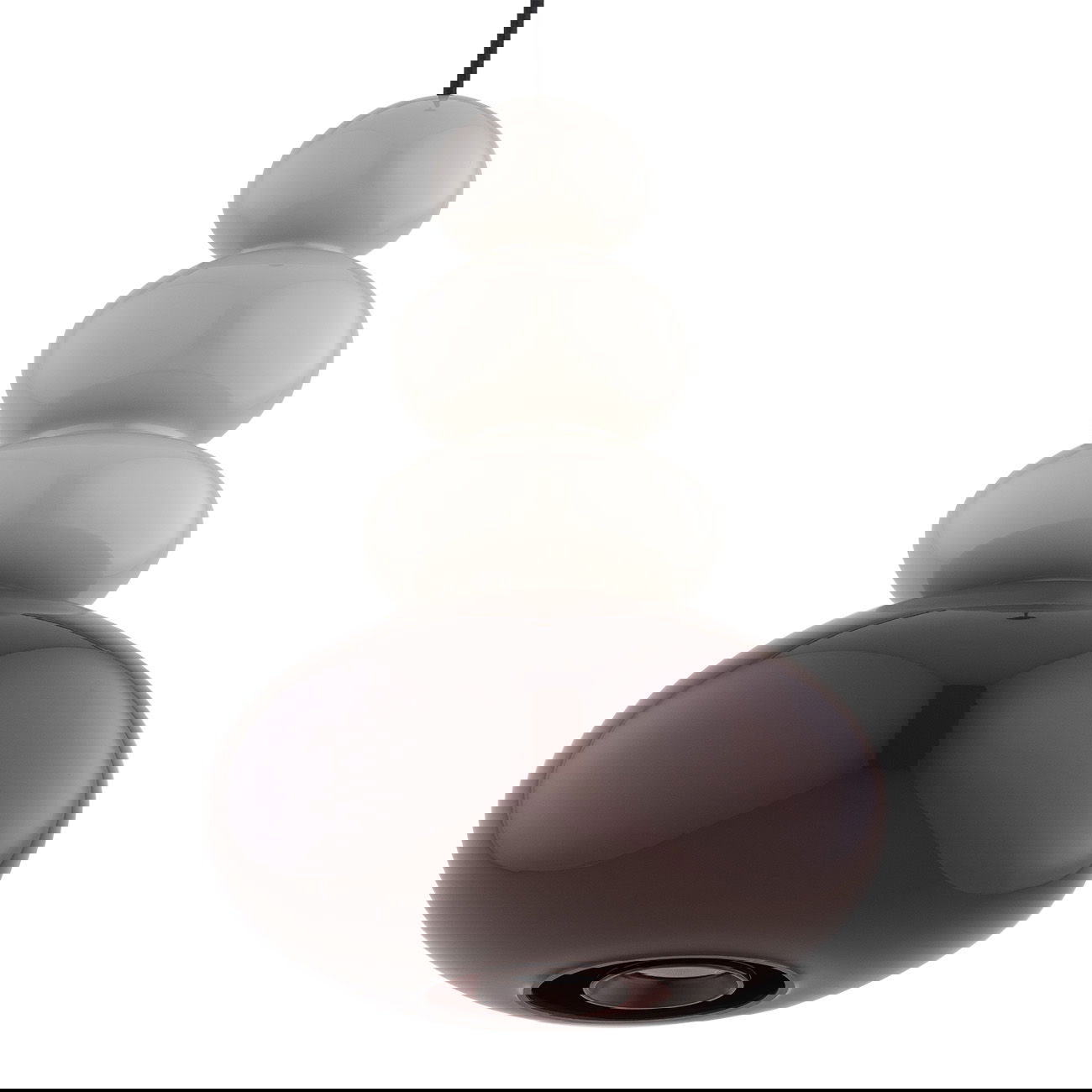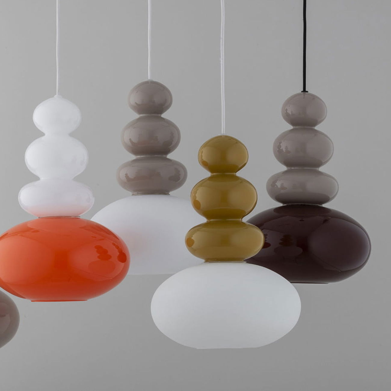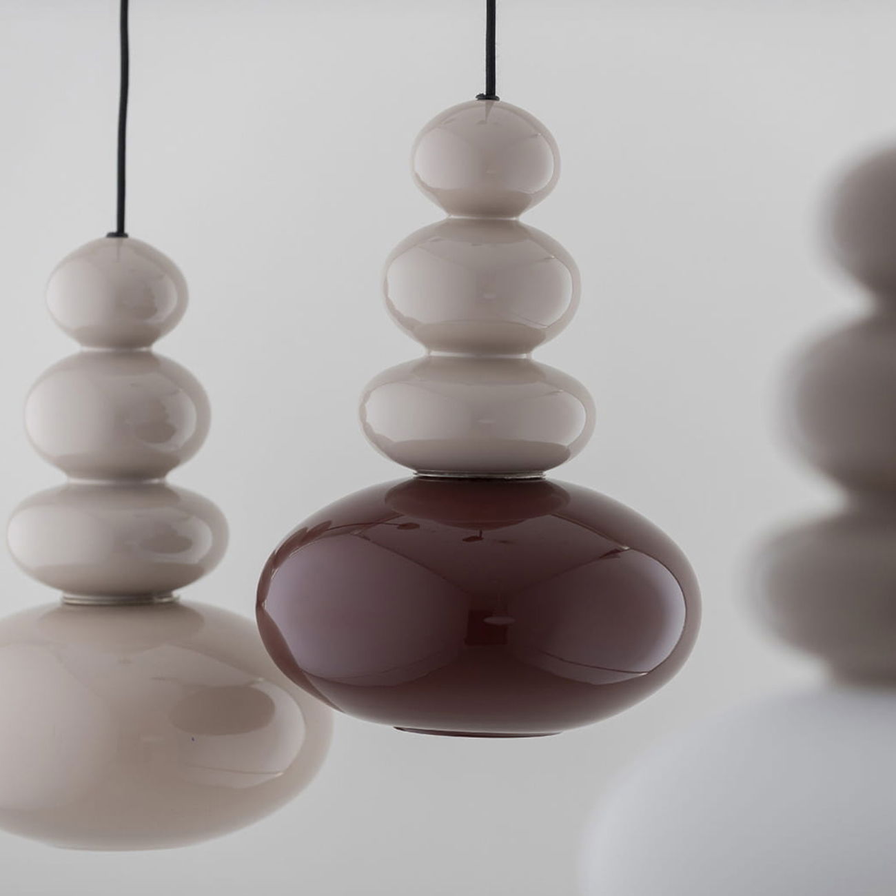 The Rodrigo glass pendant light has a tiered design. A large terracotta shade sits at the base, and three sand-coloured glass bubbles rise above it, which are connected in one piece.