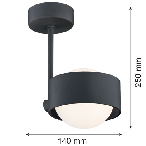 The Black Simo IP44 has an adjustable head that tilts to direct light, and due to the IP44 rating, it can be used in a bathroom. The ceiling lamp mounts close to the ceiling on a short rod and hangs 25cm down overall.