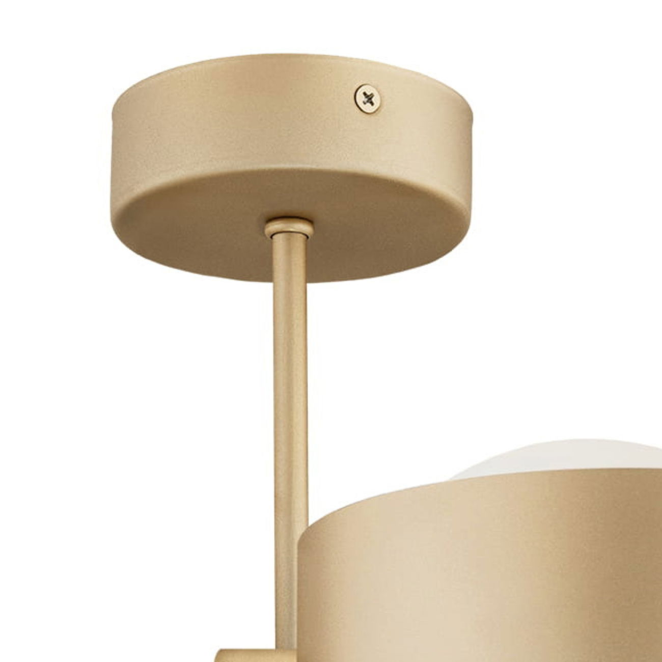 The Gold Simo IP44 Semi Flush Ceiling Lamp has a dual-shade design with an outer gold cylinder band and inner opal glass globe. The adjustable head can tilt to direct light, and it is rated IP44 for bathroom use.