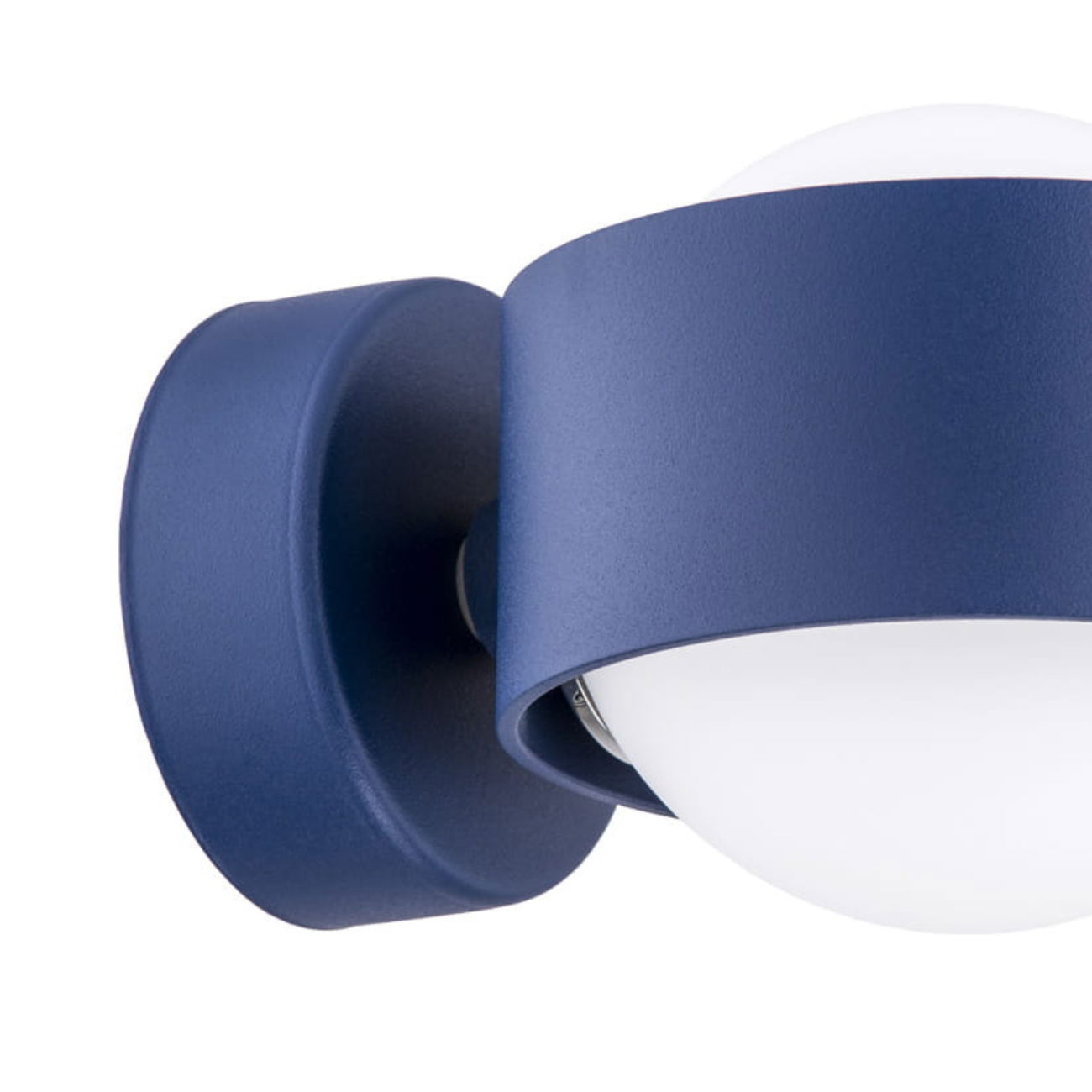 The Blue Simo IP44 Round Wall Light has a navy blue steel cylinder band with a white opal glass globe underneath, which covers the light bulb. The shade can be turned and positioned at different angles to direct the light output. Due to the IP44 rating, it can be used as a bathroom wall light if required.