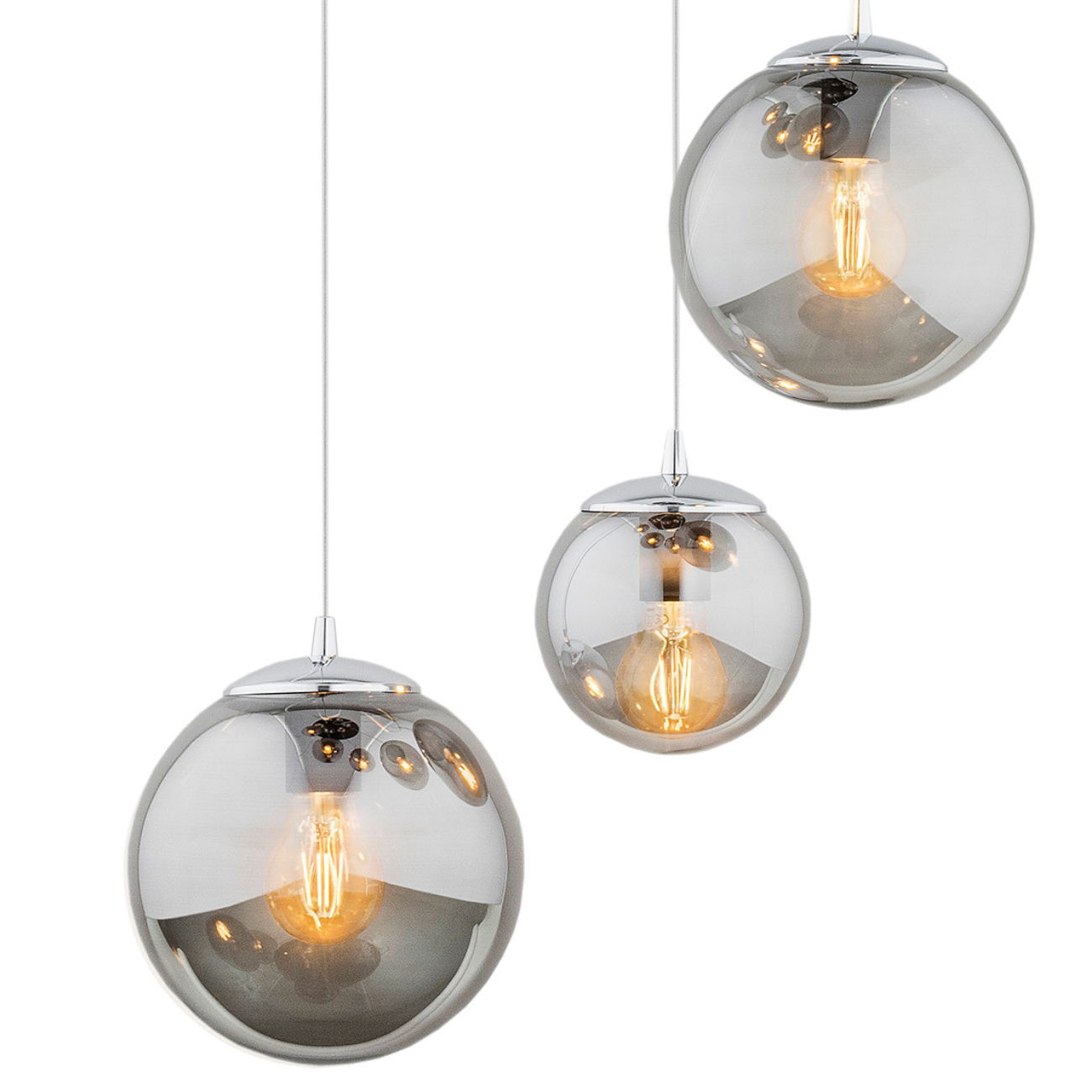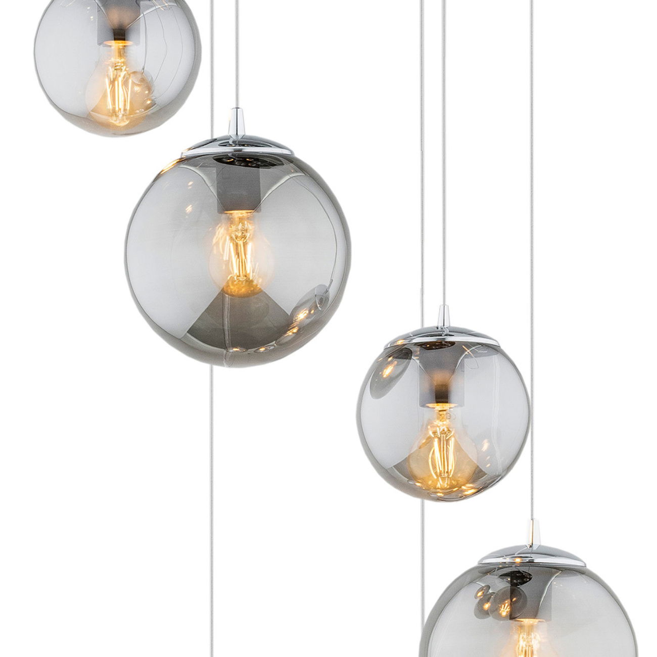 The Tica Multi-Drop Pendant Light has six grey glass spheres suspended from a polished chrome round circular plate. Each globe is finished in a smoked grey glass and comes in two sizes.