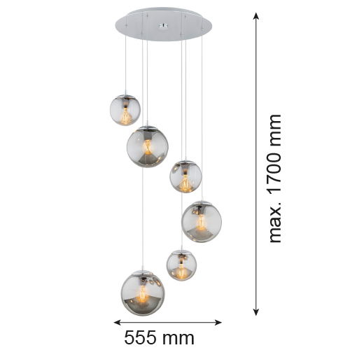 - Hangs 170cm total drop from the ceiling to the lowest sphere. This can be shortened if required at the point of installation.