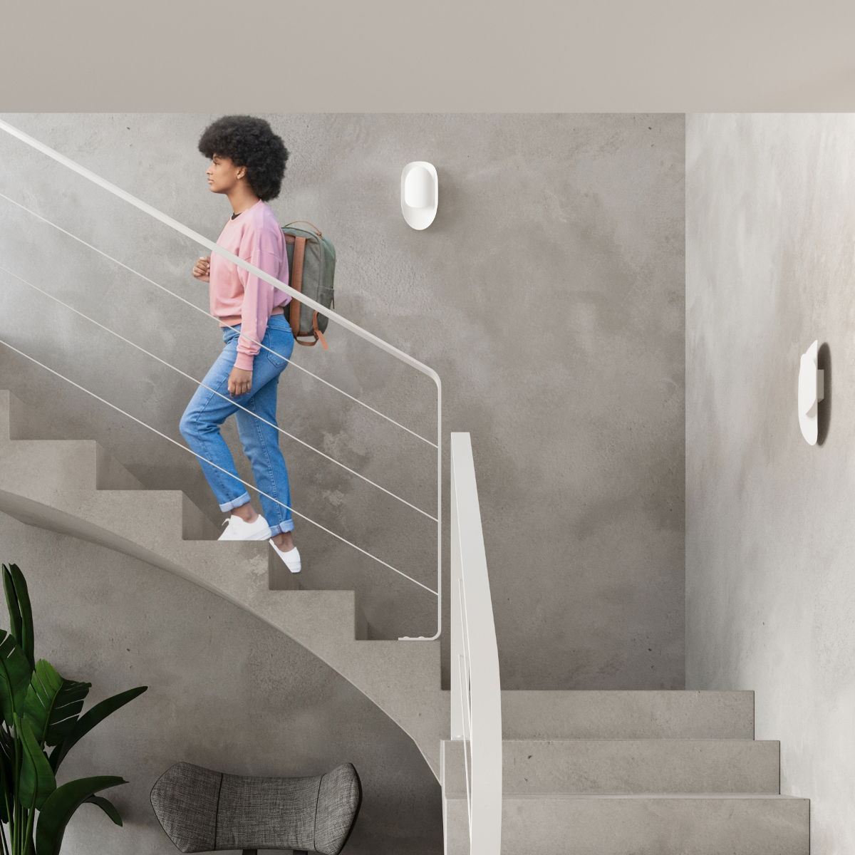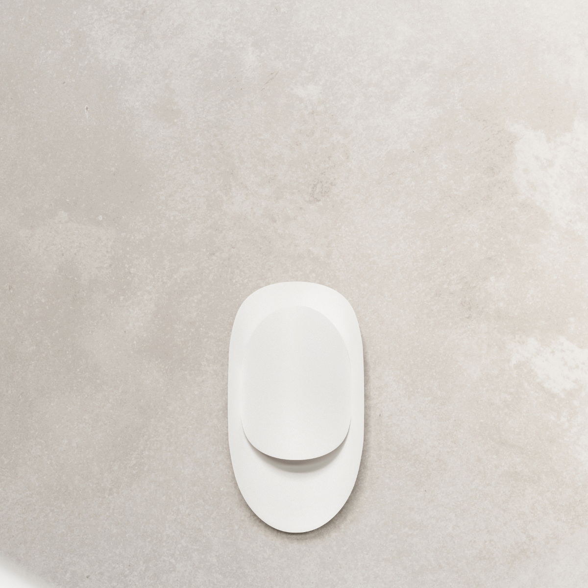 The Tier White Wall Lamp has a rounded oval body in matt white metal, with a recessed inner oval opening that emits light above and below the fitting.