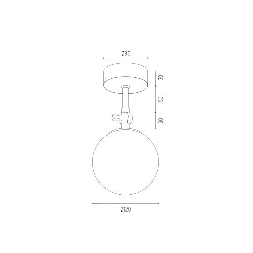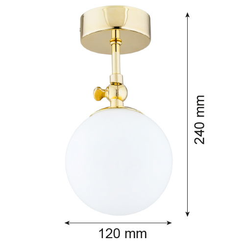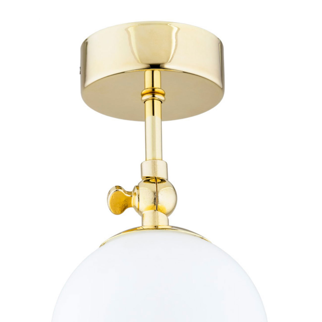 The Tina 1-lamp IP44 ceiling light has a single opal glass globe on a brass stem. The circular ceiling rose is 8cm across, and a ball joint at the bottom of the brass arm lets you angle the globe.