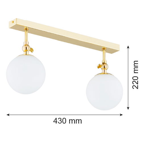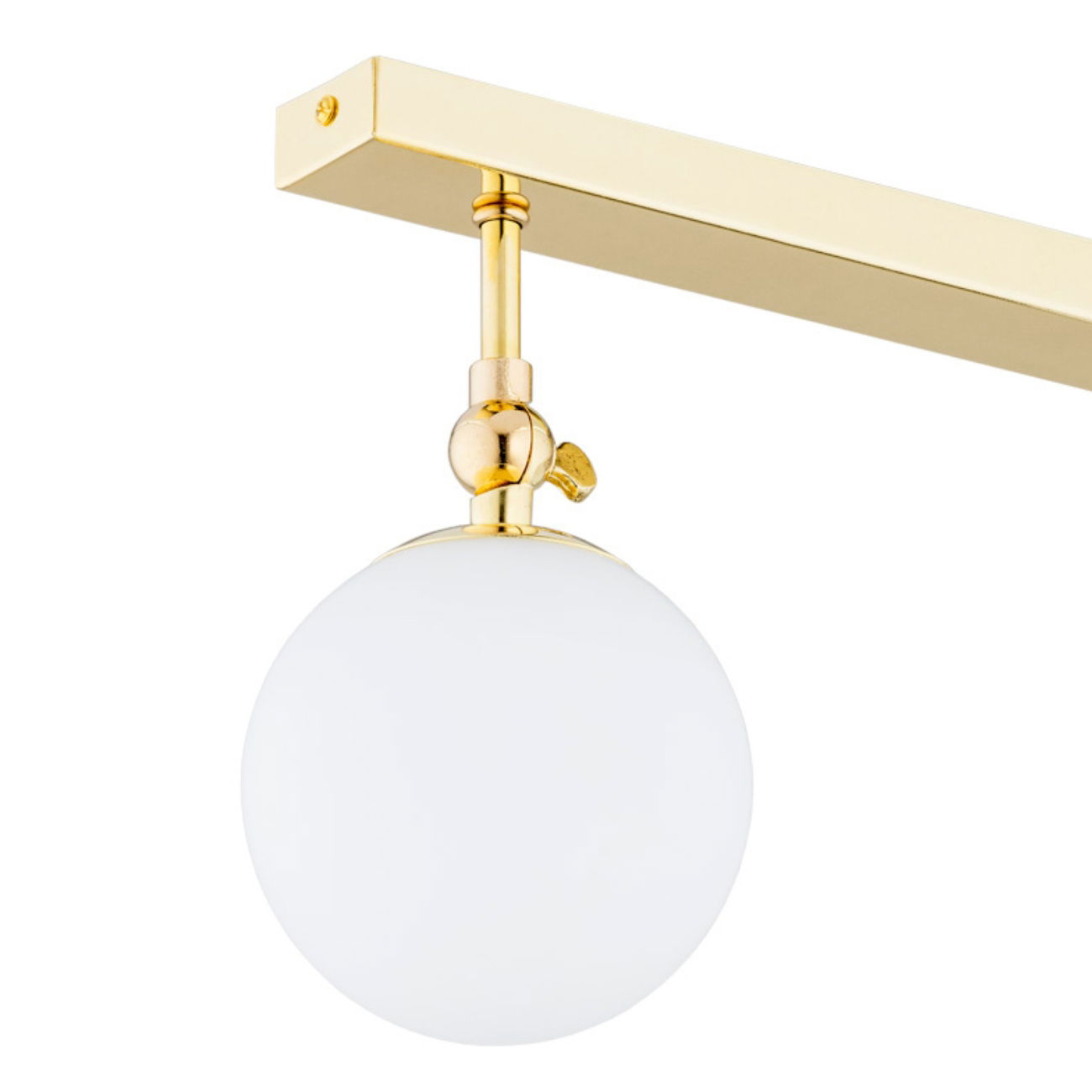 The Tina IP44 linear brass ceiling lamp has two opal glass globes on a 42cm brass bar. Each globe sits on a short brass stem with a ball joint, which can tilt the globes to different angles. IP44 rated, which means it can be used in a bathroom if required.