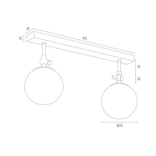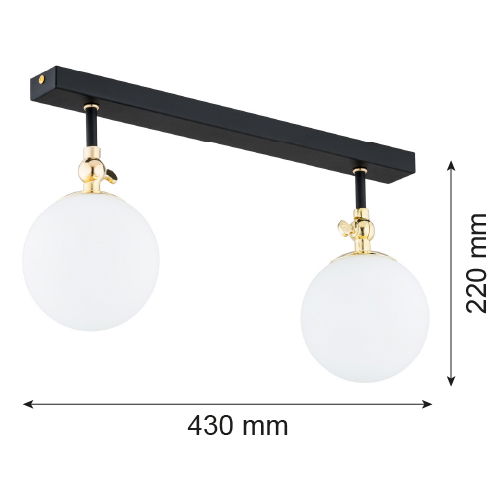 The Tina IP44 Linear Ceiling Lamp has two opal glass globes on a slim black bar with an adjustable brass pivot, which lets you set the globe angle.