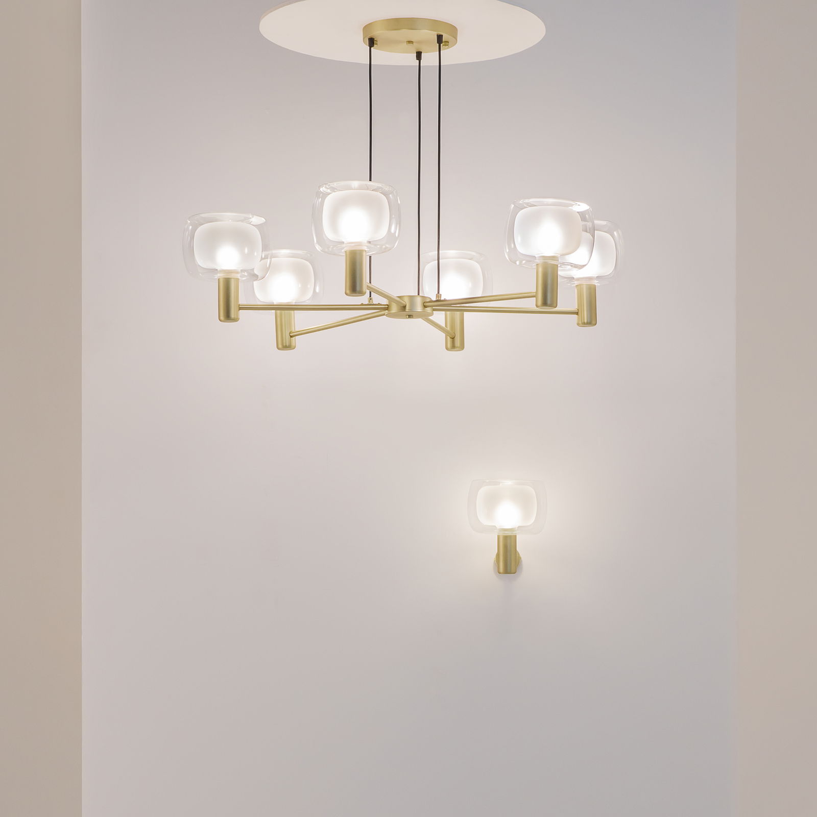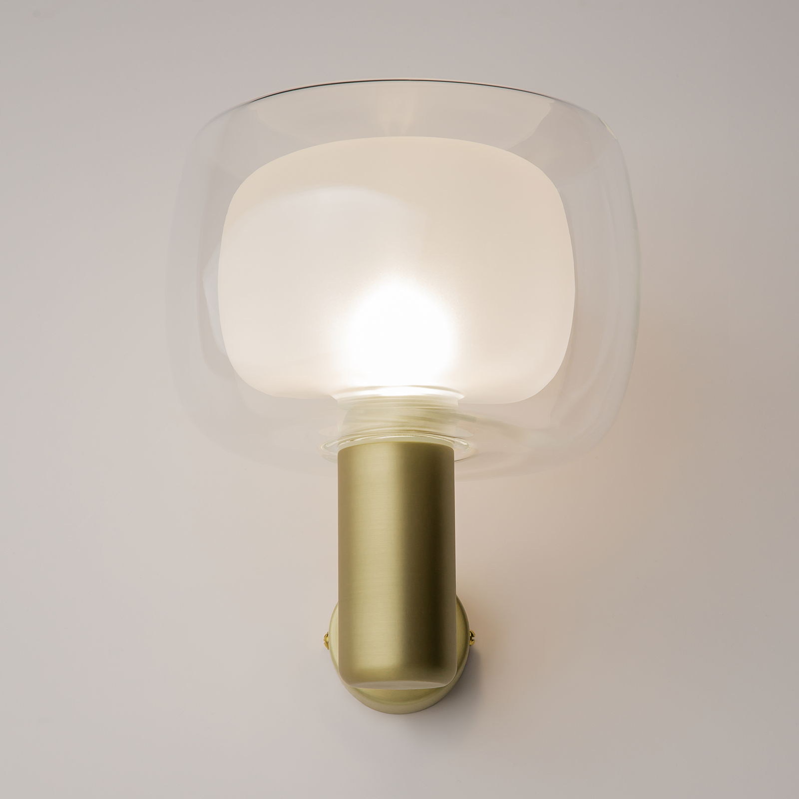 The Vision wall light is 18cm wide with an upward-facing glass shade. The gold metal arm extends out from the wall plate to hold a clear and frosted glass shade, which covers the lamp holder. The shade provides the effect that there are two shades; however, they are attached and removed together as one.